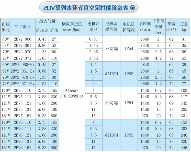 2BV系列水環式真空泵適用于抽出氣體和水蒸氣,吸氣壓力可以達到33mbar絕壓(97%真空度) 。當水環真空泵在吸氣壓力接近極限真空(工作液的飽和蒸汽壓)下長期工作時,應聯接汽蝕保護管,以對泵進行保護。作為壓縮機用時,其壓力大至0.26MPa (絕壓)。2BV系列水環真空泵作為新一-代節能型產品,其以優良的性能及眾多優點將取代同性能的SK/2SK系列水環真空泵及W/WY/WL系列往復真空泵。2BV2- -Ex/2BV6系列水環式真空泵/壓縮機主要用于抽出爆炸性氣體,及各類易燃、易爆環境中工作,其性能參數與2BV2/2BV5系列相同。