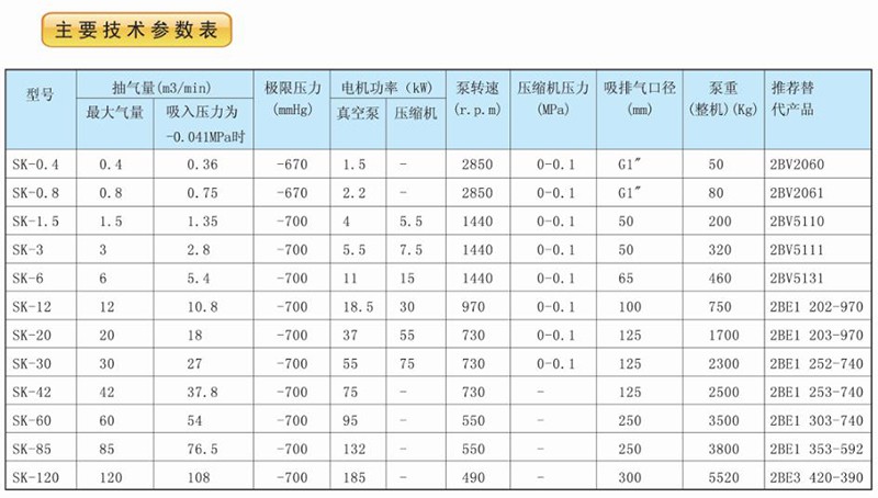 SK系列水環(huán)式真空泵及壓縮機被廣泛應用于機械、石油化工、制藥、食品、制糖工業(yè)及電子領域。由于在工作過程中氣體的壓縮過程是等溫的,所以在壓縮和抽吸易爆炸氣體時,不易發(fā)生危險,所以其應用更加廣泛。作為80年代的水環(huán)真空泵技術,SK系列水環(huán)泵目前雖仍有用戶在使用,但因其效率低,性能差,將逐漸被2BV、2BE1 系列節(jié)能水環(huán)泵所取代。